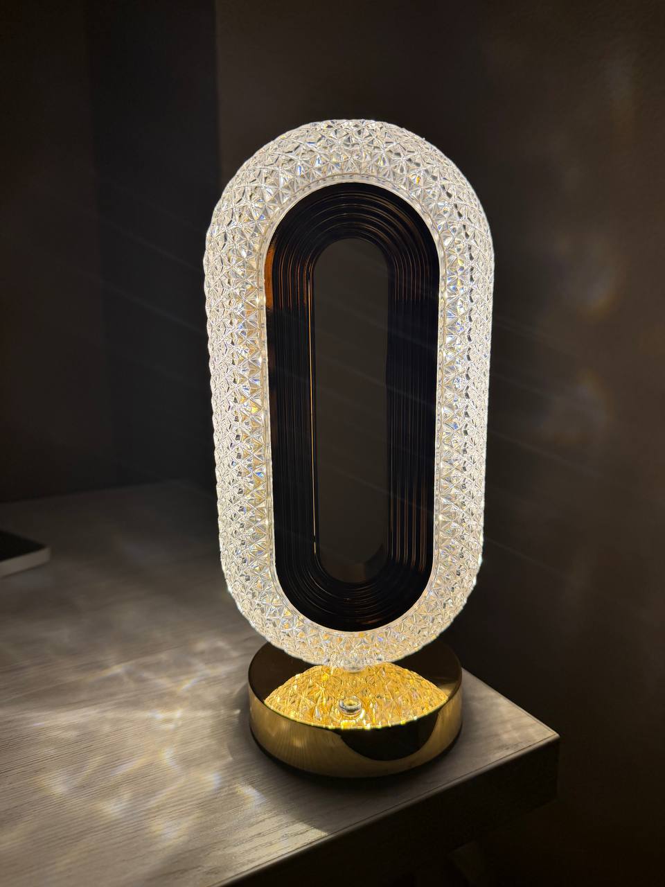 Shakli: Lampaning yuqori qismi oval yoki arka shaklida bo‘lib, u kristall yoki shishani eslatuvchi qirrali (fasetali) shaffof materialdan ishlangan. Bu element yorug‘likni chiroyli sindirish effektini yaratadi. Ushbu "arka"ning ichki qismida chuqurlik va kontrast beruvchi to‘q rangli (ehtimol qora yoki to‘q jigarrang) halqalar mavjud. • Asosi (tagligi): Lampaning asosi yumaloq shaklda bo‘lib, oltin yoki jezga (latunga) o‘xshash yaltiroq materialdan tayyorlangan. U ham o‘ziga xos teksturaga ega bo‘lib, yorug‘likni sindirishi natijasida stol yuzasida chiroyli naqshli jilo hosil qiladi. • Yorug‘lik: Lampa iliq, oltinsimon nur taratadi. Bu nur shaffof qoplama orqali mayin tarqaladi va asosidan aks etadi. Stol ustida lampa yaratgan yorug‘lik dog‘laridan iborat jozibali naqsh ko‘rinib turibdi. • Materiallar: Abajur (yuqori qismi) uchun shisha yoki akril, asosi uchun esa oltin rangli metalldan foydalanilgan deb taxmin qilish mumkin. • Umumiy ko‘rinishi: Lampa nafis va hashamatli ko‘rinishga ega. U zamonaviy yotoqxona, mehmonxona yoki ish stoli uchun juda mos keladi va xonada shinam, sokin muhit yaratadi. • Joylashuvi: Lampa och rangli yog‘och yoki shunga o‘xshash materialdan yasalgan stol ustida turibdi. Orqa fon qorong‘i bo‘lgani uchun lampaning nur taratishi yanada yaqqol ko‘zga tashlanadi.