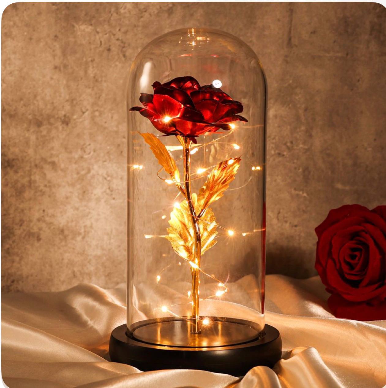 • Asosiy element: Shaffof shisha kolba (gumbaz) ichiga joylashtirilgan yorqin qizil atirgul. • Gulning detallari: Atirgulning barglari to‘q va baxmaldek ko‘rinadi. Poyasi va barglari oltinsimon qoplama bilan qoplangan, bu esa mahsulotga hashamatli va sehrli ko‘rinish beradi. • Yoritish: Atirgul atrofiga ingichka svetodiodli (LED) simli girlyanda o‘ralgan. U mayin va iliq nur taratib, shinamlik va sehrli muhit yaratadi. • Asosi (tagligi): Shisha kolba mustahkam, yumaloq shakldagi qora taglikka o‘rnatilgan. • Uslubi: Dizayn «Sohibjamol va Maxluq» (Beauty and the Beast) ertagidagi mashhur atirguldan ilhomlanib yaratilgan.
