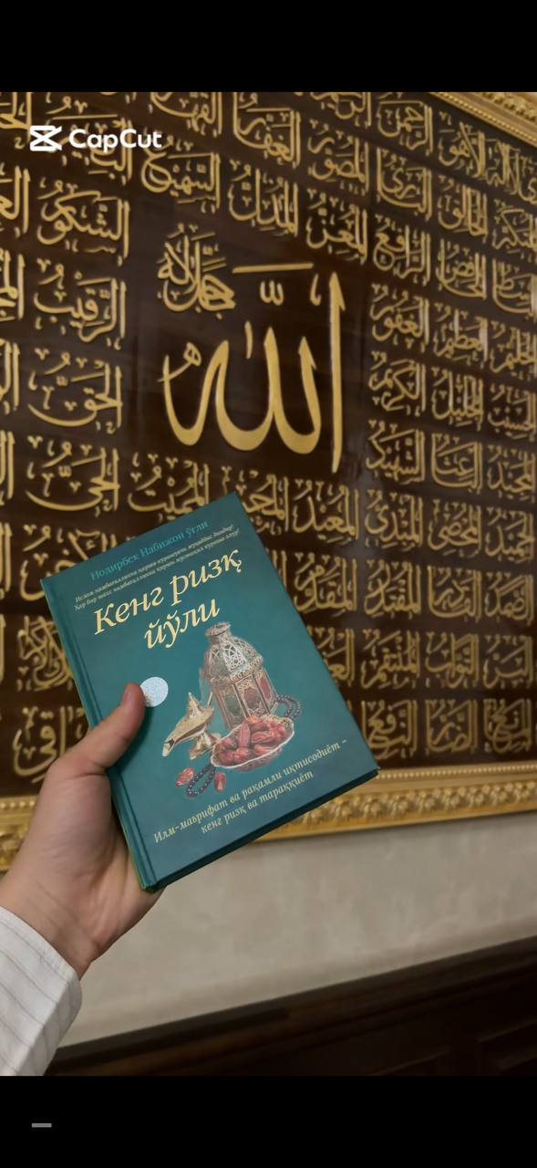 • Kitob nomi: "Кенг ризқ йўли". • Muallif: Nodirbek Nabijon o'g'li. • Mavzusi: Kitobning pastki qismida "Илм-маърифат va raqamli iqtisodiyot — keng rizq va taraqqiyot" deb yozilgan. Bu shuni anglatadiki, asarda inson farovonlikka erishishi uchun ham ma'naviy-ma'rifiy bilimlar, ham zamonaviy iqtisodiy bilimlar (raqamli texnologiyalar) muhim ekanligi yoritilgan. • Fon (orqa ko'rinish): Kitob arab xattotligi bilan bezatilgan devoriy rasm (panno) fonida ushlab turilibdi. Unda Allohning 99 ismi (Asmoul husno) yozilgan, markazda esa "Alloh" lafzi alohida ajratib ko'rsatilgan.