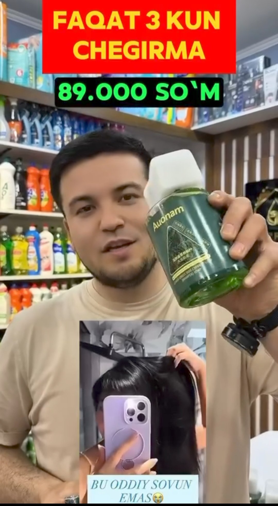 1. Tarkibi: Mahsulotlar tarkibida asosan zanjabil (imbir), ko‘p gulli gorets (He Shou Wu), jenshen va boshqa shifobaxsh o‘tlar ekstraktlari borligi aytiladi. 2. Vada qilingan natijalar: • Soch to‘kilishiga qarshi: Soch ildizlarini mustahkamlash va yangi sochlar o‘sishini tezlashtirish. • Oq sochlarga qarshi: Reklamalarda ushbu vosita soch ildizlarini oziqlantirish orqali sochlarning tabiiy rangini qaytarishga yordam berishi ta’kidlanadi. • Sog‘lom ko‘rinish: Bosh terisini chuqur tozalash va sochlarga jilo (blisk) berish. 3. Turi: Ular ko‘pincha to‘q rangli qattiq sovun shaklida yoki siz yuborgan suratdagi kabi shaffof idishdagi quyuq yashil suyuqlik ko‘rinishida bo‘ladi. 4. Ommabopligi: Instagram va TikTok ijtimoiy tarmoqlarida "oldin va keyin" ko‘rinishidagi natijalar ko‘rsatilgan videolar tufayli O‘zbekistonda juda ommalashib ketdi.